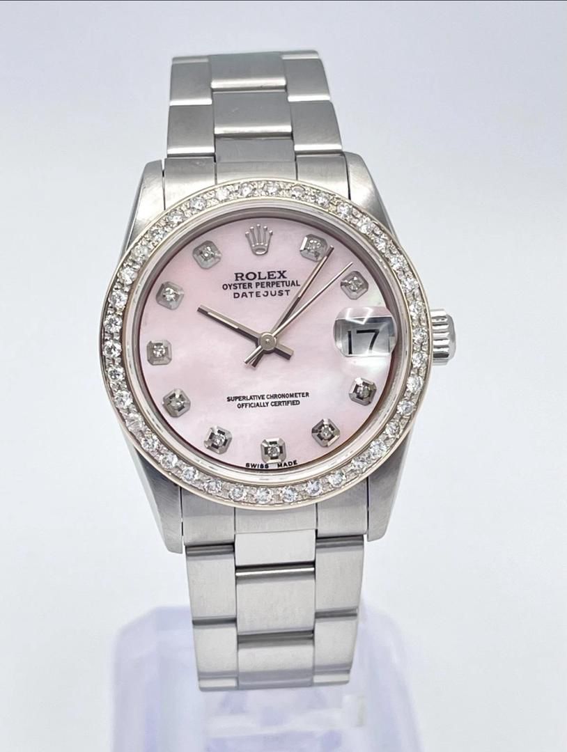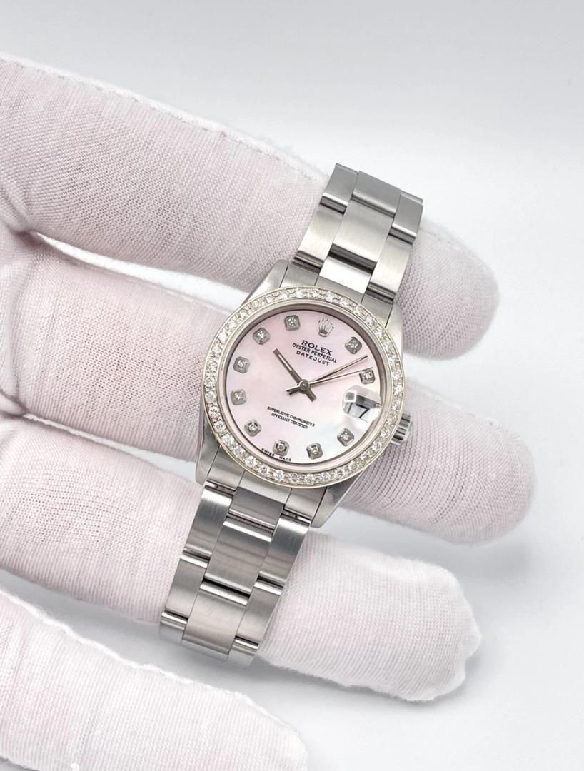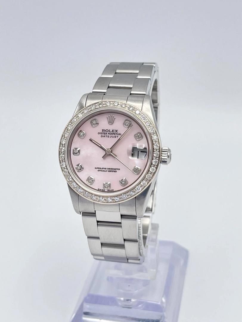 Montre Rolex Datejust 31 mm pour femme, cadran en nacre rose, lunette en diamants, boîte Oyster, 68240